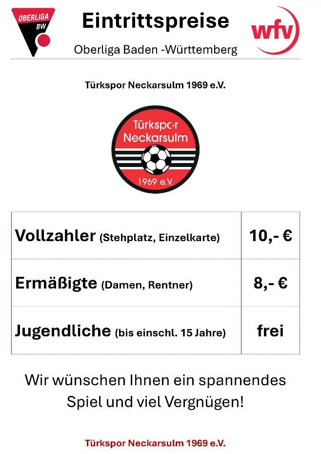 Sie erwerben eine Eintrittskarte zu einem Heimspiel der Oberliga Mannschaft Türkspor Neckarsulm 1969 e.V. ( VOLLZAHLER ) Sie erhalten die Eintrittskarten am Stadioneingang dort wird sie für Sie hinterlegt.